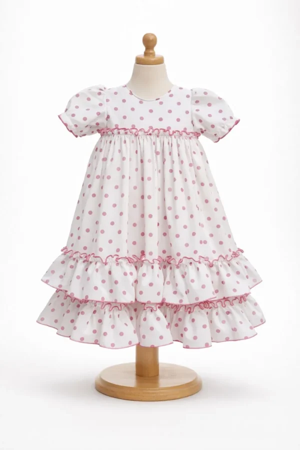 Confeccionada en tejidos de algodón perforado, esta bata garantiza transpirabilidad y suavidad para pieles delicadas. La tira fruncida en el bajo y el cordoncillo en el filo de color destacan como detalles únicos del diseño, mientras que el cierre de cremallera en la espalda facilita la colocación de la prenda. Es ideal tanto para bebés de 0 a 36 meses como para niñas que visten desde la talla 4 a la 12 años.