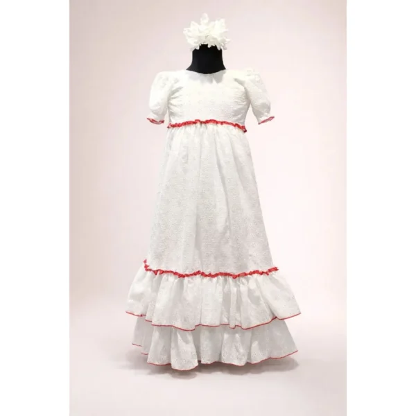 Confeccionada en tejidos de algodón perforado, esta bata garantiza transpirabilidad y suavidad para pieles delicadas. La tira fruncida en el bajo y el cordoncillo en el filo de color destacan como detalles únicos del diseño, mientras que el cierre de cremallera en la espalda facilita la colocación de la prenda. Es ideal tanto para bebés de 0 a 36 meses como para niñas que visten desde la talla 4 a la 12 años.
