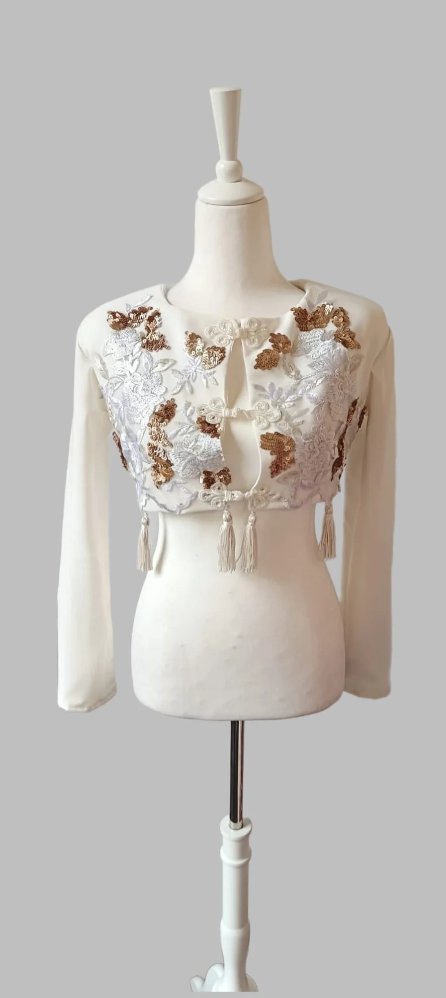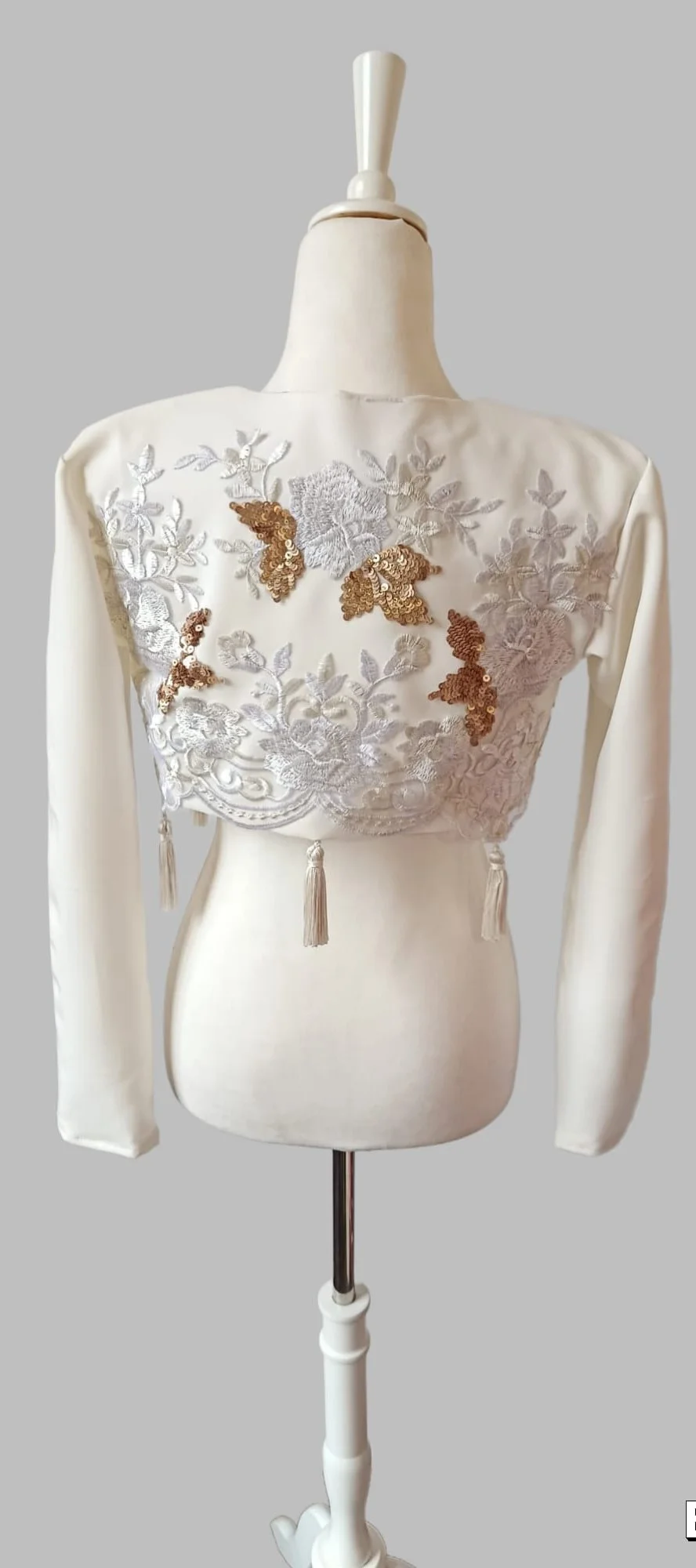 Confeccionada con tejidos de alta calidad, esta chaqueta asegura durabilidad, comodidad y un ajuste perfecto. Los materiales utilizados no solo son resistentes, sino que también aportan un acabado elegante y sofisticado. Desde sus delicados bordados hasta sus detalles en las mangas y el cuello, cada elemento está pensado para enaltecer la elegancia de quien la luce.