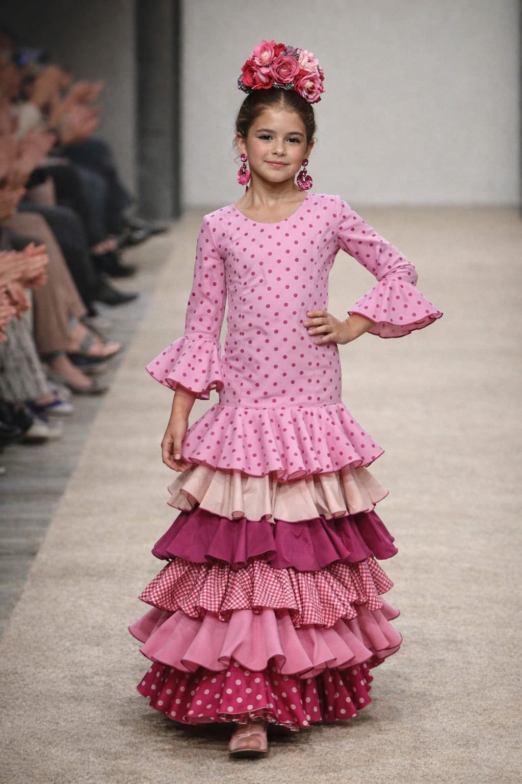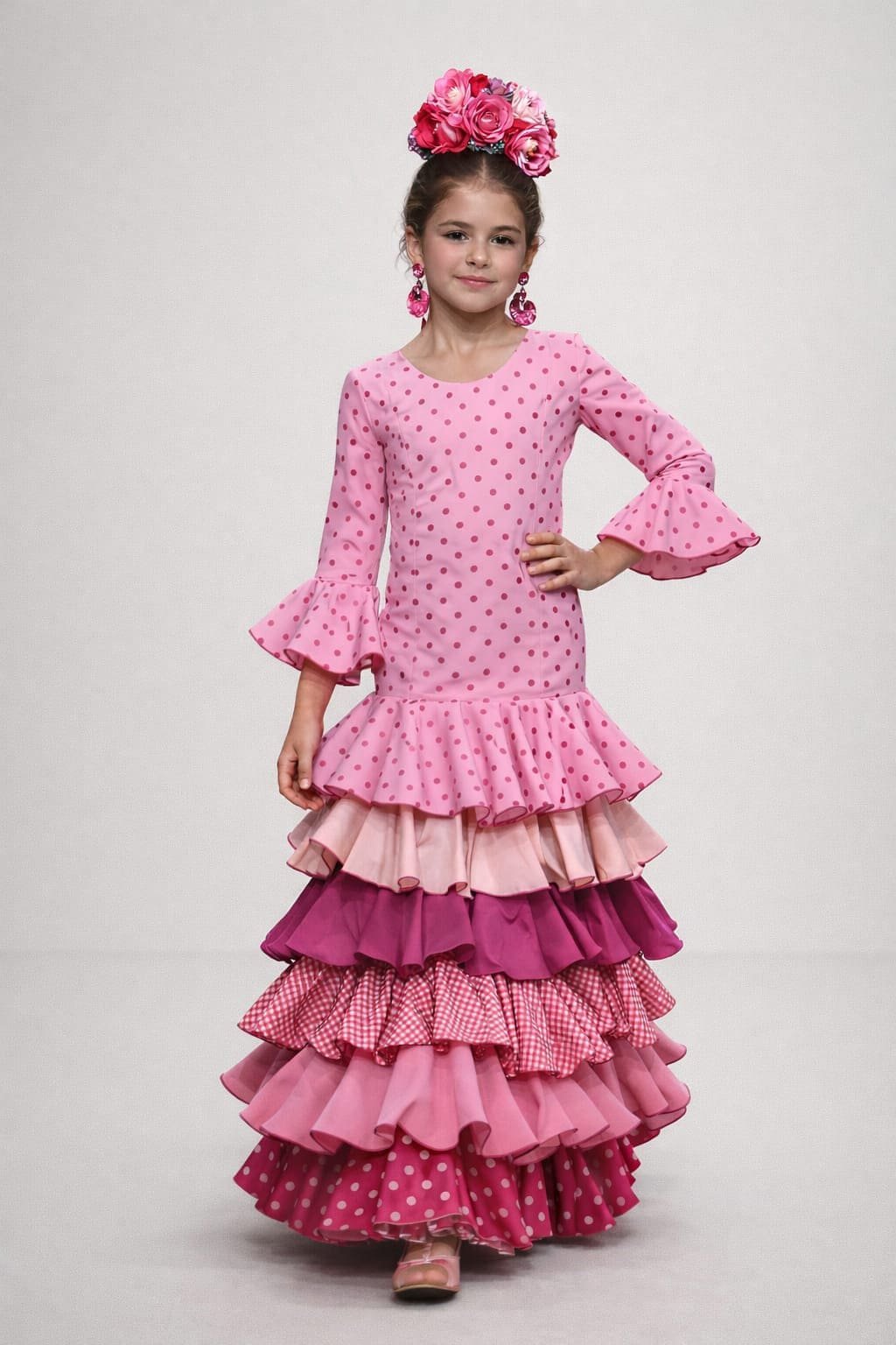 Confeccionado de forma totalmente artesanal, este vestido destaca por su combinación armónica de tonos rosa y frambuesa, jugando con lunares y volantes en capas que aportan volumen, movimiento y una presencia espectacular. El cuerpo entallado realza la silueta, mientras que las mangas acampanadas aportan ese aire flamenco clásico con un toque dulce y actual.