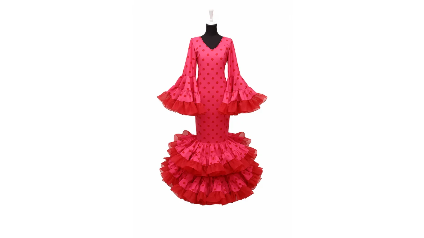 Este vestido está diseñado específicamente para realzar la figura y brindar máxima comodidad durante cualquier evento flamenco. Sus mangas largas con amplio volante ofrecen un movimiento espectacular que complementa la danza, mientras que la falda de gran vuelo con volantes en cascada añade dinamismo y energía al bailar. La combinación de forma y funcionalidad asegura que cada movimiento sea realzado con gracia y fluidez.